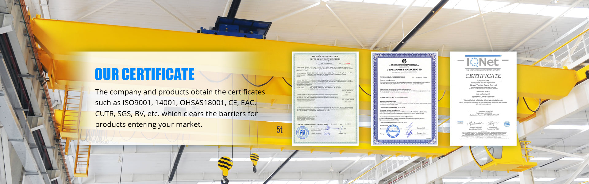 Mohli bychom dodávat všechny druhy průmyslových jeřábů od 0,25 tony na 900 tun, pass GB / T 19001-2000 idt ISO 9001: 2000, GB / T 24001-2004 idt ISO 14001: 2004, GB / T 28001-2001, OHSAS 18001: 1999, CE, GOST, SGS, TUV, BV a tak dále.
